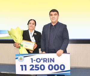 2-o'rinni egallagan Toshkent shahar Mirzo Ulug'bek tumani “Sultoniya” mahallasidan Mavluda Abduqodirovaga mukofotni “Nuroniy” jamg'armasi respublika Boshqaruvi raisi o'rinbosari Shuhrat Usmonov topshirdi.